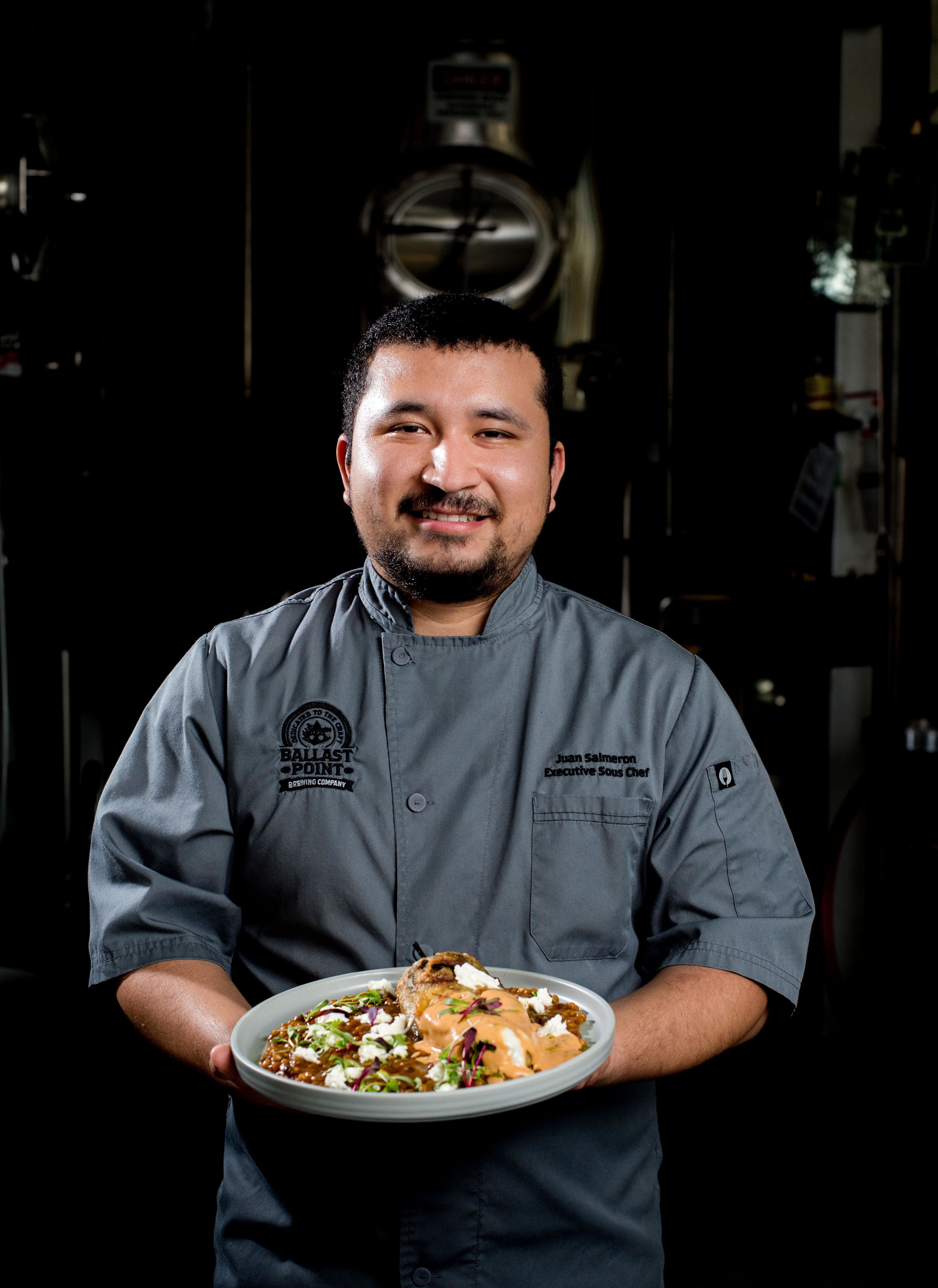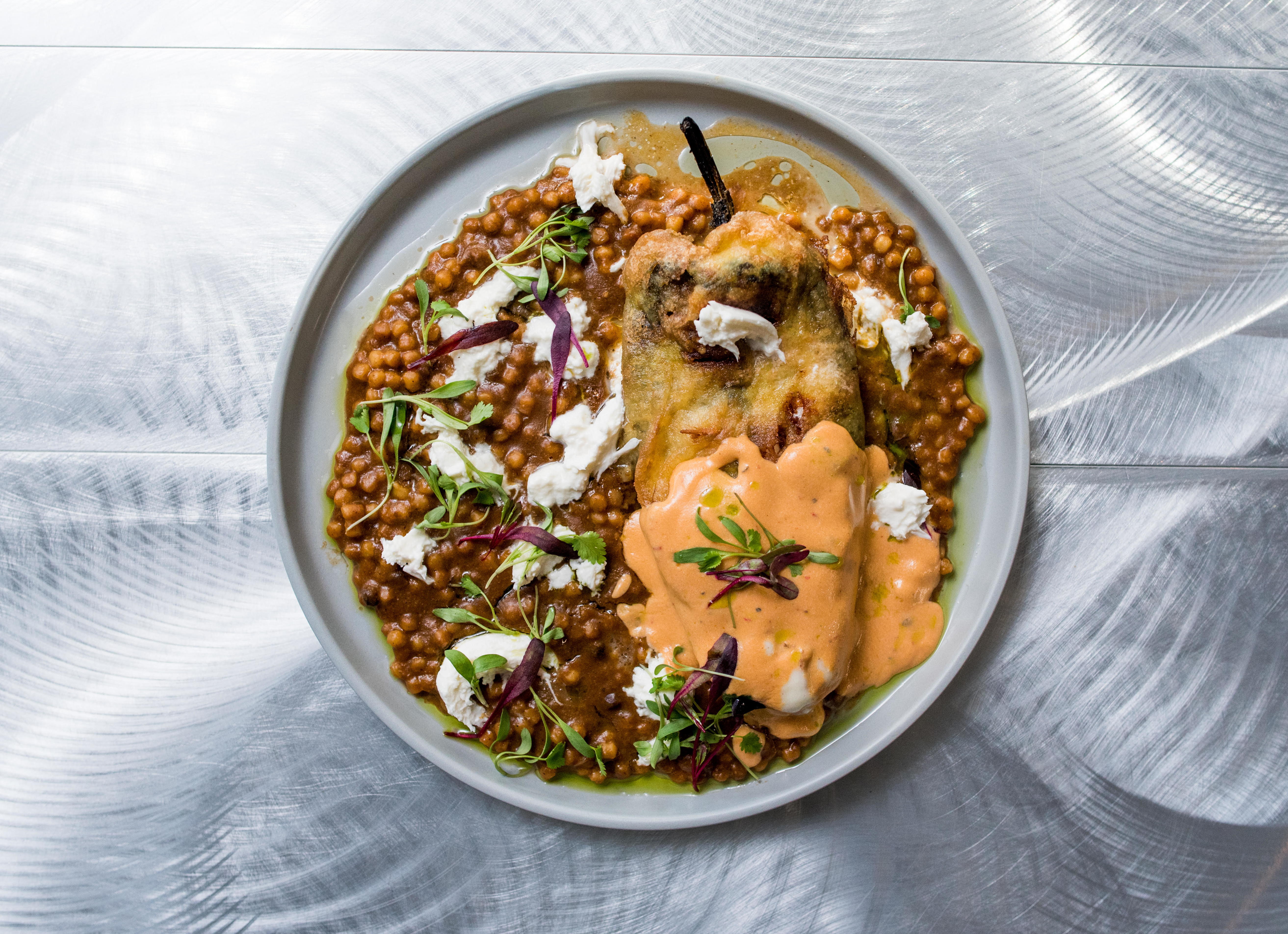 Plate the fregola, place the Chile Relleno on it and top with Chipotle creamed ricotta and micro herbs